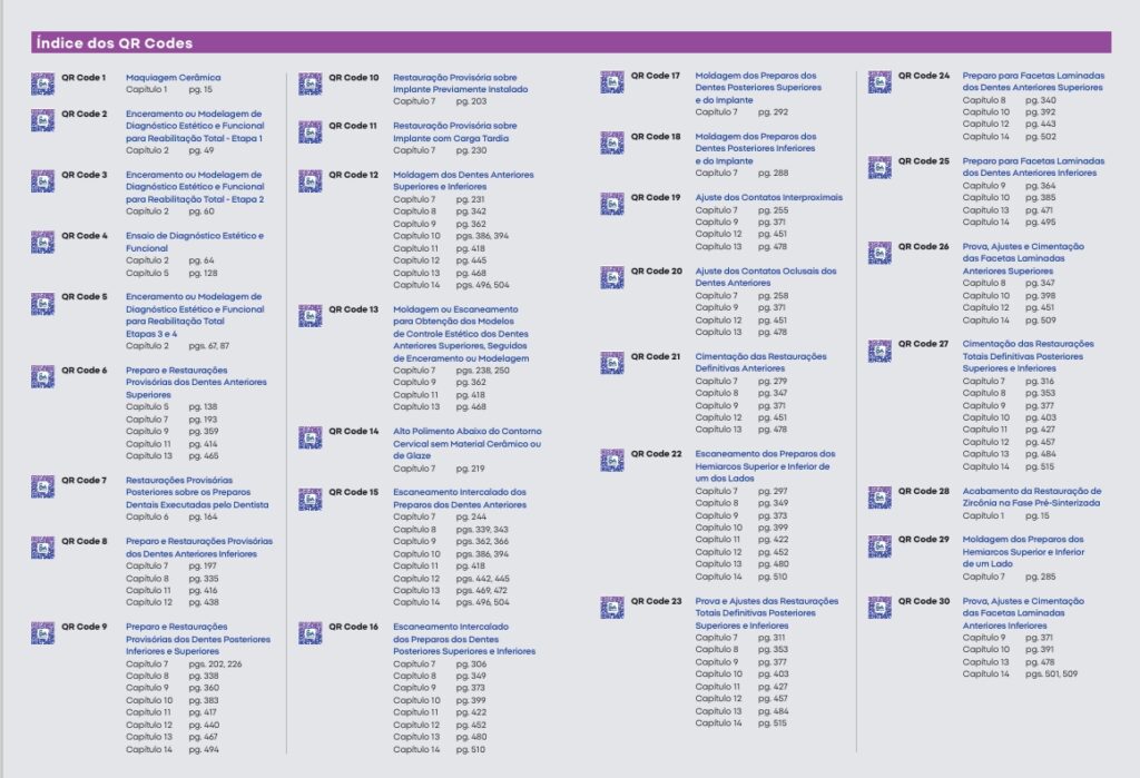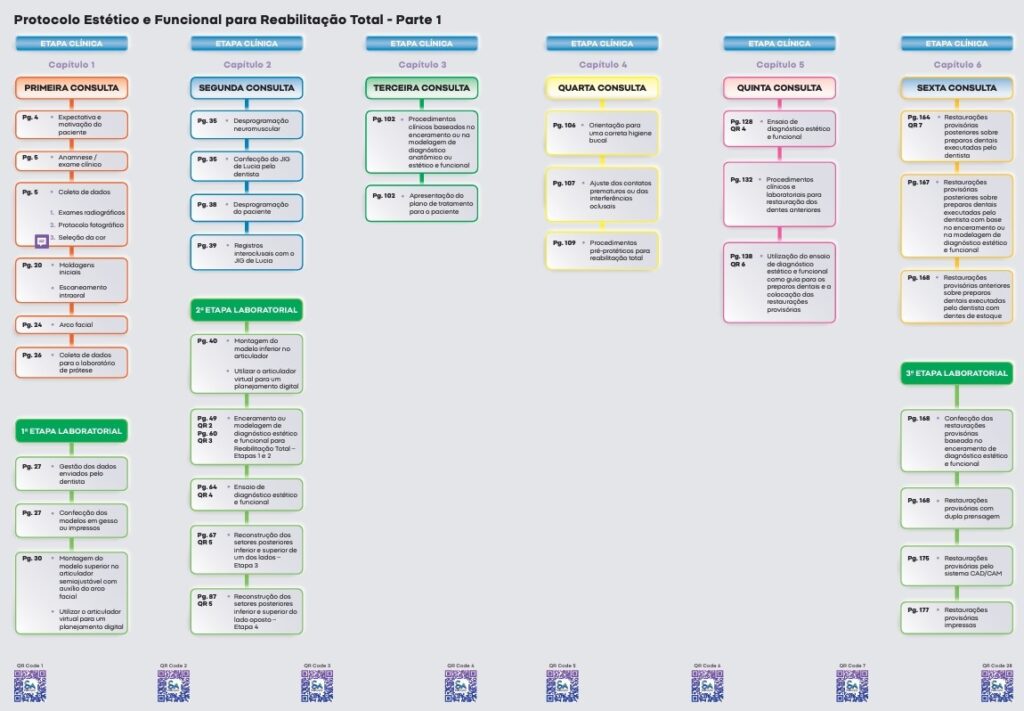 Para cada modalidade, o fluxo de procedimentos clínicos está individualizado, sendo acompanhado do número de página correspondente e do número do seu QRCode: